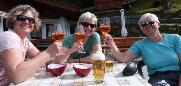 Doch dazwischen liegt noch die Helmhanghütte auf 1610 m, die steuern wir an. Heute haben wir Zeit für einen Frühschoppen. Pünktlich um 10.00 Uhr