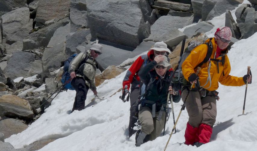 ist nichts zu sehen, doch irgendwann taucht er auf. Wir verlassen den Gletscher und seilen aus. Ohne Gepäck treten wir zum Gipfelsturm an.