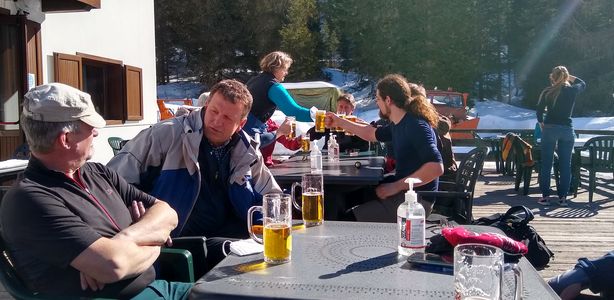 Lago Misurina. Um 11.00 Uhr erreichen wir unsere Unterkunft, das Albergo Miralago am Lago Misurina. Wir machen Quartier und trinken erst mal ein Bierchen auf der