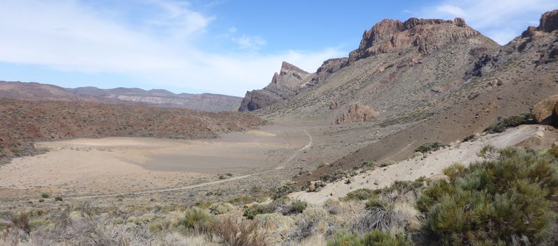 Auf etwa 2700 m endet die breite Schotterpiste. Nach links weist ein Schild zum Montana Blanca, wir halten uns rechts und