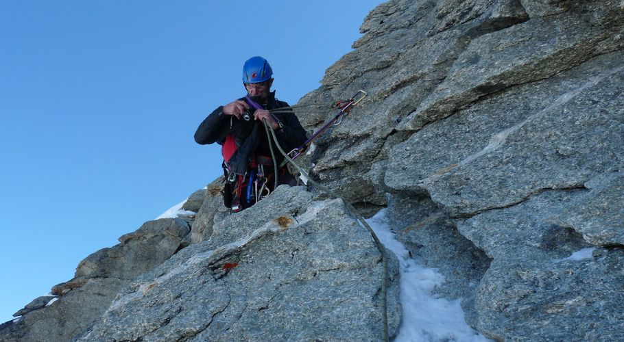 seile ich ab und traversiere so die Binerplatte. So müssen wir nicht zurückklettern.